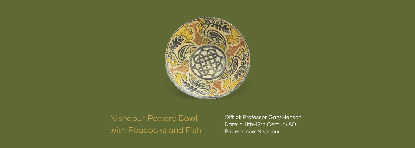 This bowl was found in Nishapur, in present day north-eastern Iran, a region that often changed rulers. The bowl is earthenware with a white slip and detailed, hand painted decorations, with a clear glaze on the surface. The fish and peacock motifs and the usage of dots are very common on pottery found throughout the Near East. The peacock was part of a Persian folklore creation story, and in Islam the spreading tail of the peacock was both a symbol of the universe and a representation of two opposing symbols of light, the moon and sun. Fish have connotations of wisdom in Islam. Though beautiful, this bowl would have been used every day, as most pottery was decorated and people took pride in owning and using beautiful objects. As Islam forbad the depiction of animals and humans, this bowl would have been used in a household and not a mosque.
